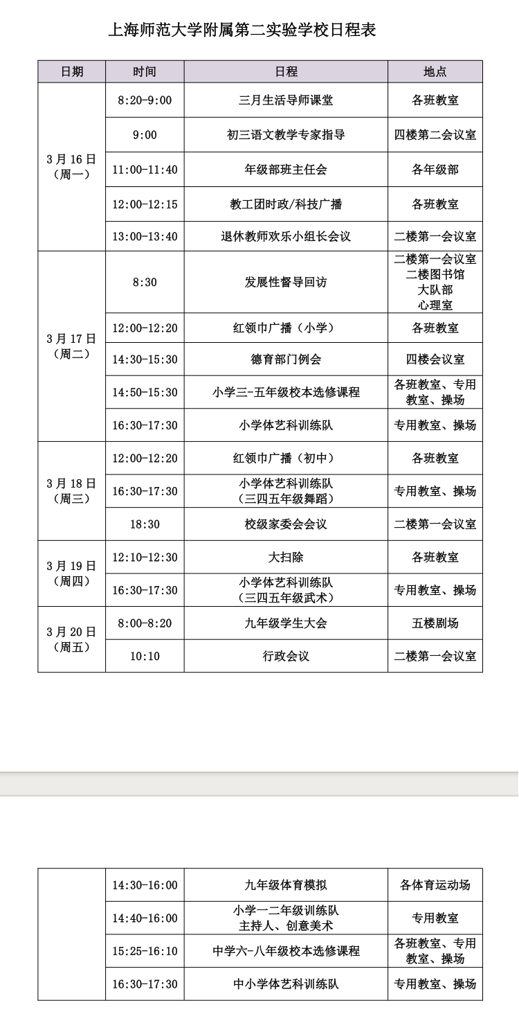 日程表(3月16日-3月20日)
