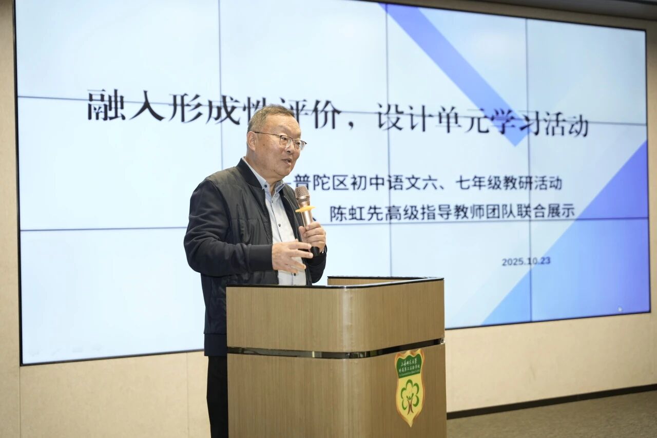 2025年10月24日下午,普陀区初中语文“融入形成性评价,设计单元学习活动”主题教研活动,暨焦南、陈虹先高指学科团队联合展示活动在上海师范大学附属第二实验学校开展。全区六、七年级语文教师济济一堂,通过两节展示课、团队单元设计分享和专家引领,共同探索文言文教学融入形成性评价的教学新路径。活动由普陀区教育学院语文教研员周静老师指导,并特邀上海市新优质学校研究所常务副所长、原普陀区教育学院院长杨杰老师莅临指导。