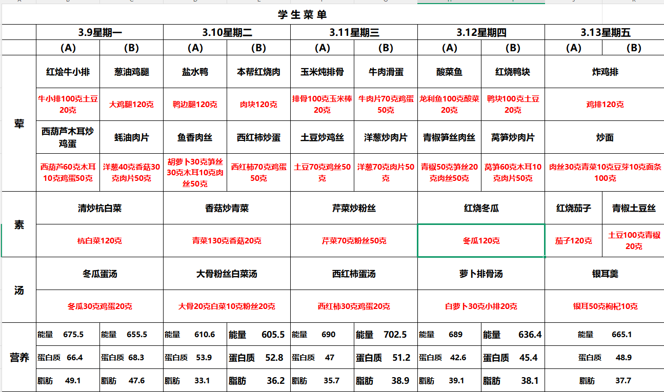 学生菜单3.9~3.13