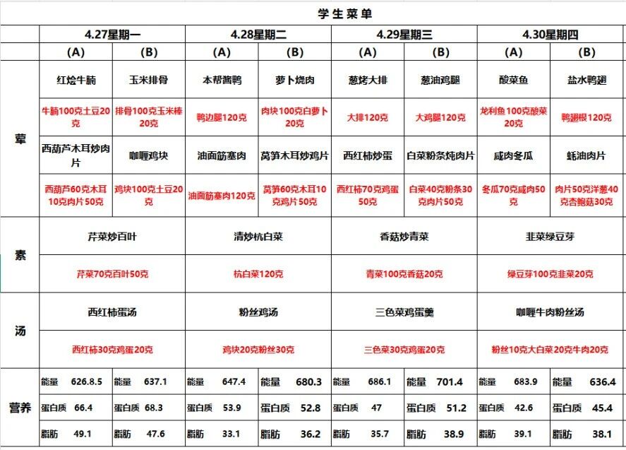 学生菜单4.27~4.30