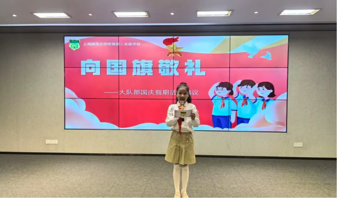 国庆假期将至,为让爱国情怀在心中深深扎根,大队委员殷艺萌同学代表大队部发出倡议:让我们以 “弘扬伟大抗战精神 做光荣自豪中国人” 为初心,在假期里主动向国旗致敬。